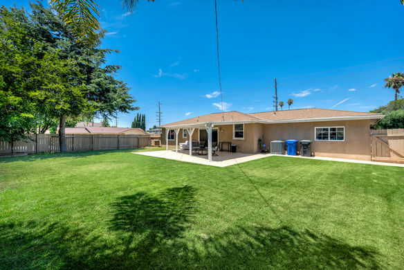Charming CORNER-Lot Single-Story Home that is in incredible move-in condition. Everything is done and ready to move in! REMODELED Kitchen & Baths with a LARGE Backyard and NEW Roof! The front yard boasts BIG grass lawns and eye-catching stamped colored concrete & brick surfacing. Inside, you discover the living area's OPEN floorpan and the FANTASTIC upgraded wood flooring found THROUGHOUT. The Living Room is BRIGHT from large windows to the front and has direct access to the FINISHED 2-car garage where Laundry is located. The Kitchen was COMPLETELY REMODELED in 2022 and showcases stunning QUARTZ countertops, modern SHAKER-style cabinets, CHIC glass- & stone- mosaic backsplashes, a roomy center island, and STAINLESS-STEEL appliances. Flanking the kitchen, the Dining Room enjoys a flood of natural light & backyard views from MILGARD dual-paned sliding glass doors. Down the hall, two secondary bedrooms provide ample living space and the Primary Bedroom offers a peaceful retreat with backyard views, enjoying a REVAMPED en-suite bathroom that matches the hall bath: both given RE-TILED tub showers with elegant glass-mosaic trims, RAISED-basin vanities, and UPGRADED tile flooring. Outside the private backyard features a covered stamped concrete patio and a SPRAWLING grass lawn, perfect for relaxation and entertaining. Additional highlights include a quality NEW $26K HVAC system (2021)! A NEWER Hot Water Heater and fantastic DUAL-PANED ''Anlin'' windows!