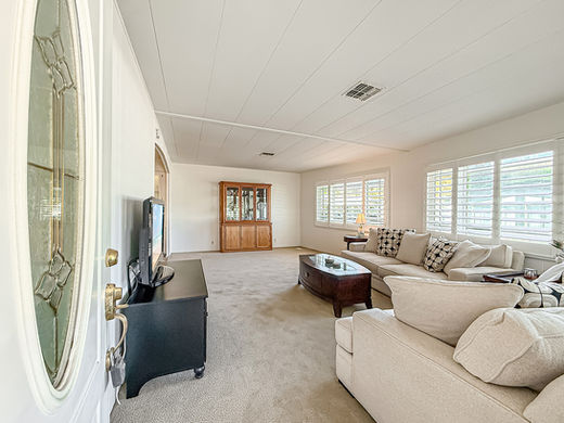 Charming & SUPER BRIGHT Mobile Home in the Gated and COVETED 55+ Vallecito Mobile Home Community of Newbury Park! A private & covered front patio welcomes you home and serves as a great spot to enjoy morning coffee, afternoon reading, or relaxed evenings with friends. Step inside the home and you're greeted by a light-filled interior where tall windows adorned with plantation shutters allow sunshine to pour throughout the home. The spacious Living Room is flooded with natural light and provides an inviting setting for everyday living and entertaining alike. Adjacent, the Dining Area is thoughtfully appointed with a ceiling fan and built-in drawers & cabinetry for storage & dinnerware. The Kitchen offers generous proportions & abundant cabinetry, QUARTZ countertops, and a spacious center island, open to the Family Room which has handsome wood-like flooring built-in bookshelves + linen cabinetry, providing both warmth and smart storage solutions. The Laundry Room is conveniently located inside the home and includes additional cabinetry along with a windowed door leading directly to the covered carport area for ease of access. The Hall Bathroom features a built-in vanity and a roomy standing shower with sliding glass doors, neighboring the ROOMY secondary bedroom which highlights plush carpet and closet with sliding mirrored wardrobe doors. The Primary Bedroom is a great size and is complete with ceiling fan, tall windows with treatments, and a long mirrored wardrobe closet. The en-suite Primary Bathroom includes a built-in vanity (with dedicated makeup station) and a grand soaking tub--an ideal place to unwind at the end of the day. Your 2-Car tandem carport space provides a tool shed at its rear and is directly accessible via door to the Laundry Room. Beyond the home itself, Vallecito residents enjoy an impressive collection of RESORT-STYLE amenities, including a gated entry, a sparkling heated pool and spa, BBQ area, 18-hole putting greens, and a community dog run. The newly renovated clubhouse features a fantastic gym, pool and billiards room, table tennis room, library, meeting and event room with dance floor, and a full-size clubhouse kitchen perfect for hosting gatherings and celebrations. Ideally situated in beautiful Newbury Park, this home is close to scenic hiking and biking trails, shopping, dining, and convenient freeway access!