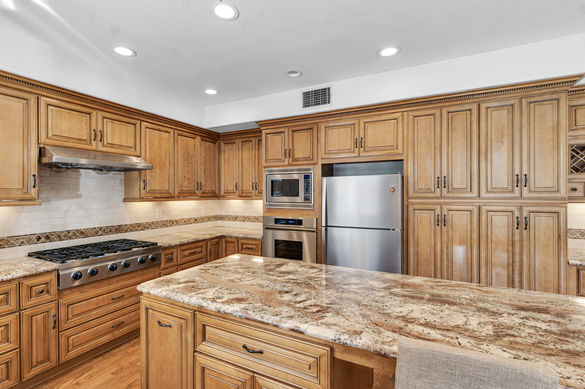 Welcome to this Stunning 5 Bedroom, 5 bath upgraded home! Nestled on a spacious 8,482 square foot lot, this 3,163 square foot residence BUILT IN 2000 exudes elegance and comfort! As you approach the entry via the paver-stone surfaced front courtyard, the GRAND rotunda-style entry impresses with soaring ceilings and beautiful wood flooring. The Living Room, featuring tall windows and a grand gas fireplace with a tile-surfaced facade, offers a cozy retreat. Adjacent, the dining room overlooks the courtyard and showcases a continuation of wood flooring, perfect for formal gatherings. The GOURMET Kitchen has been completely revamped with handsome tile backsplashes, granite countertops, and a HUGE center island with breakfast bar seating for FOUR! It boasts stainless-steel appliances including a 6-burner Decor gas cooktop and Dacor convection oven. Opening seamlessly to the kitchen, the Family Room enjoys views of the backyard and features a charming gas fireplace, creating an ideal space for media entertainment & relaxation. Downstairs, a spacious GUEST SUITE offers privacy & comfort, complete with wood flooring, a FULL en-suite bathroom, and views of the backyard. The Laundry Room is equipped with ample built-in cabinet storage and a convenient wash basin. Upstairs, the expansive primary bedroom retreat is flooded with natural light and includes brand new carpet, BIG windows overlooking the backyard and courtyard, and DUAL WALK-IN closets! The en-suite bathroom features ceramic tile flooring, a GRAND soaking tub set within a tile surround, TWO separated built-in vanities, a DEEP tile-walled shower, and a private water closet. The backyard is a PRIVATE oasis with a terraced rear slope, a covered stamped concrete patio, a sprawling paver-stone outdoor space, and a built-in flagstone-surfaced BBQ area with stainless-steel appliances. Additional highlights include a 3-car garage with finished ceiling and walls, MILGARD dual-paned windows, and a dual HVAC system. Located in a sought-after area with excellent schools, parks, and hiking trails nearby, this home offers unparalleled luxury and convenience. Don't miss the opportunity to make this extraordinary property yours!